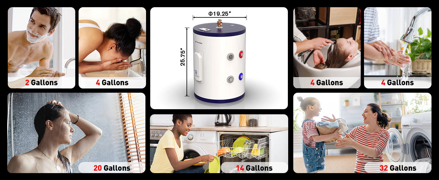 This 18-gallon point-of-use electric water heater is perfect for delivering consistent hot water for daily household tasks — from washing dishes and doing laundry to enjoying a relaxing 20–25 minute shower. Pre-set to 125°F, with adjustable temperature control ranging from 90°F to 150°F via the built-in thermostat.