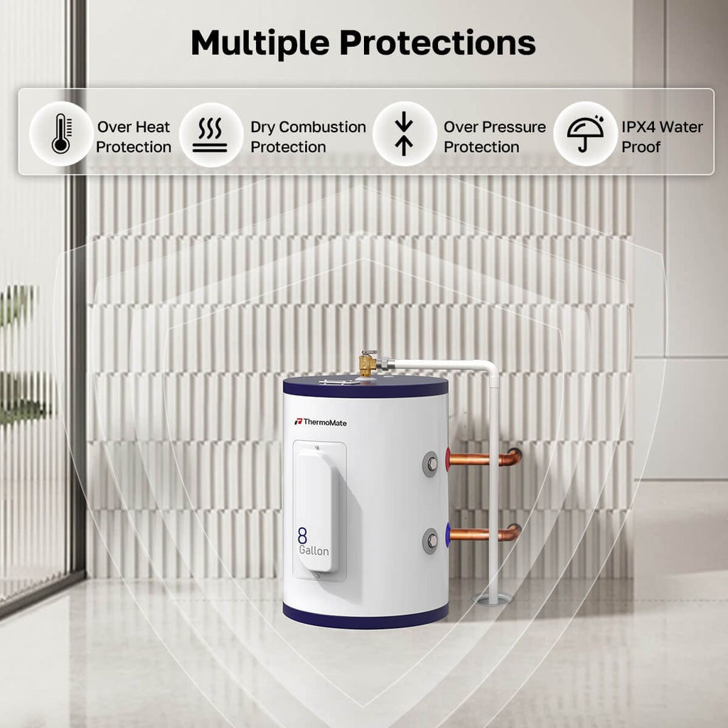 【8 Gallons Point of Use】 Delivers enough hot water for sink washing, dishwasher, washing machine, or a quick 8–12 minute shower. Factory set to 125°F, adjustable between 90°F–150°F with built-in thermostat.