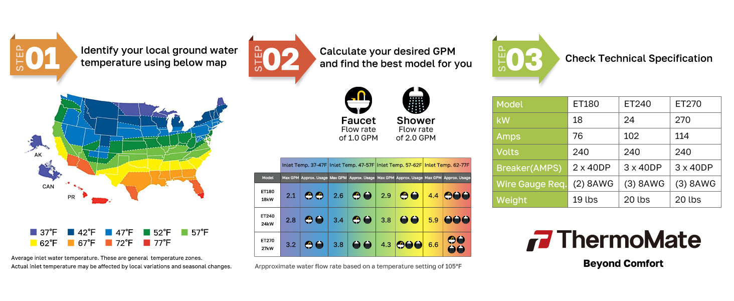 【Instant Unlimited Hot Water】On demand tankless electric water heater, providing hot water in 3 seconds when you need it and as long as you need, eliminating wait time, never run out of hot water again and No More cold shower. Flow Rate 5.27GPM @35°F Rise. Requires 120Amp breaker (3 Sets of Double-pole 40AMP Breakers)